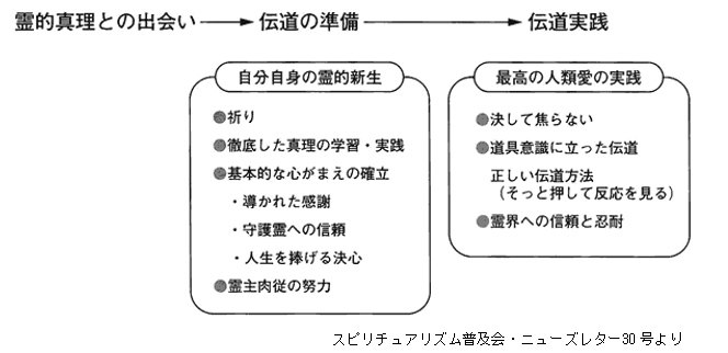 「祈り」と「真理の学習・実践」によって、スピリチュアリストとしての基本的な心がまえが確立されます。「スピリチュアリズムに導かれたことへの感謝」「守護霊の導きに対する絶対的信頼」「今後の人生をスピリチュアリズムのために捧げる決心」、こうした心がまえが、伝道のための重要な準備になります。手にした真理を自分だけのものとするのではなく、「1人でも多くの人に真理を伝えていこう」「真理普及を自分のライフワークにしていこう」と決意することです。